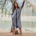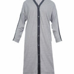 Stripe Jersey Cardigan Dress เดรสยาว ความยาวคลุมเข่า ตัดต่อแต่งกับผ้า Fleece เป็นสาบติดกระดุม แถบแต่งแขน ชุดโครงเสื้อหลวม ชายเดรสสอบเข้า มีกระเป๋าข้าง
