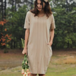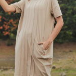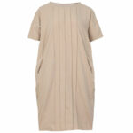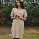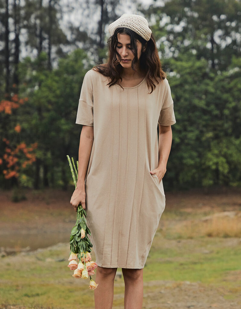 ชุดเดรสผ้ายืดทรง cocoon แพทเทิร์นตัดต่อมีวอลลุ่มช่วงตัวเดรส เก็บทรงสอบชายเดรส เนื้อผ้ายืดพิเศษสวมสบาย มีกระเป๋าข้าง ตัวชุดมีรายละเอียด ตีเกล็ดแต่งทั้งด้านหน้าและด้านหลัง